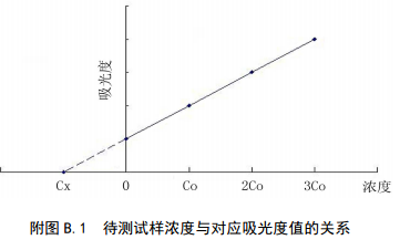 分別量取4等份量待測試樣(濃度為Cx),配制總體積相同的4份溶液。第一份不加標(biāo)準(zhǔn)溶液,第二、三、四份分別按比例加入不同濃度的標(biāo)準(zhǔn)溶液,4份溶液的濃度分別為:Cx、Cx+Co、Cx+2Co、Cx+3Co,加入標(biāo)準(zhǔn)的最小濃度Co≈0.5Cx。用空白溶液調(diào)零,在相同條件下依次測定4份溶液的吸光度值。以吸光度值為縱坐標(biāo),加入標(biāo)準(zhǔn)溶液的濃度為橫坐標(biāo),繪制校準(zhǔn)曲線,曲線反向延伸與橫坐標(biāo)的交點即為待測樣品的濃度。該方法只適用于濃度和吸光值呈線性的區(qū)域。待測試樣濃度與對應(yīng)吸光度值的關(guān)系見附圖A.1。