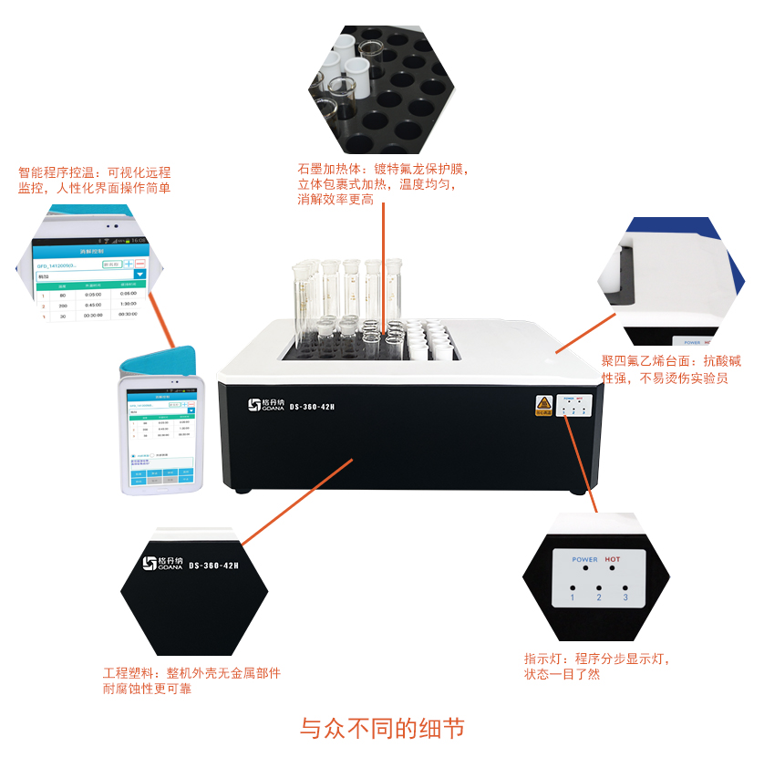 高純石墨作為加熱體,耐腐蝕;聚四氟乙烯臺面,整機外圍防腐處理,可在強酸強堿等惡劣環(huán)境中放心使用。