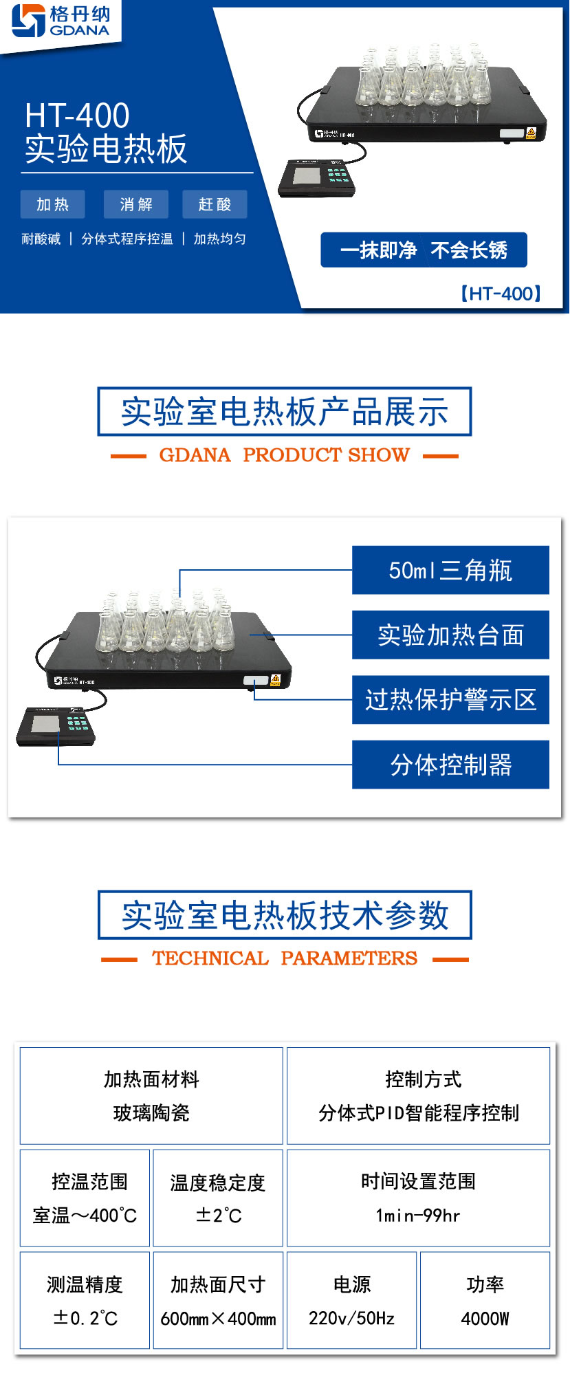 HT-400陶瓷加熱板專用于無機化學元素分析時對各類樣品作加熱、消煮、趕酸用的恒溫加熱裝置。臺面具有耐酸堿,不生銹等特性;分體PID程序數(shù)顯控溫,是實驗室樣品預(yù)處理好助手。