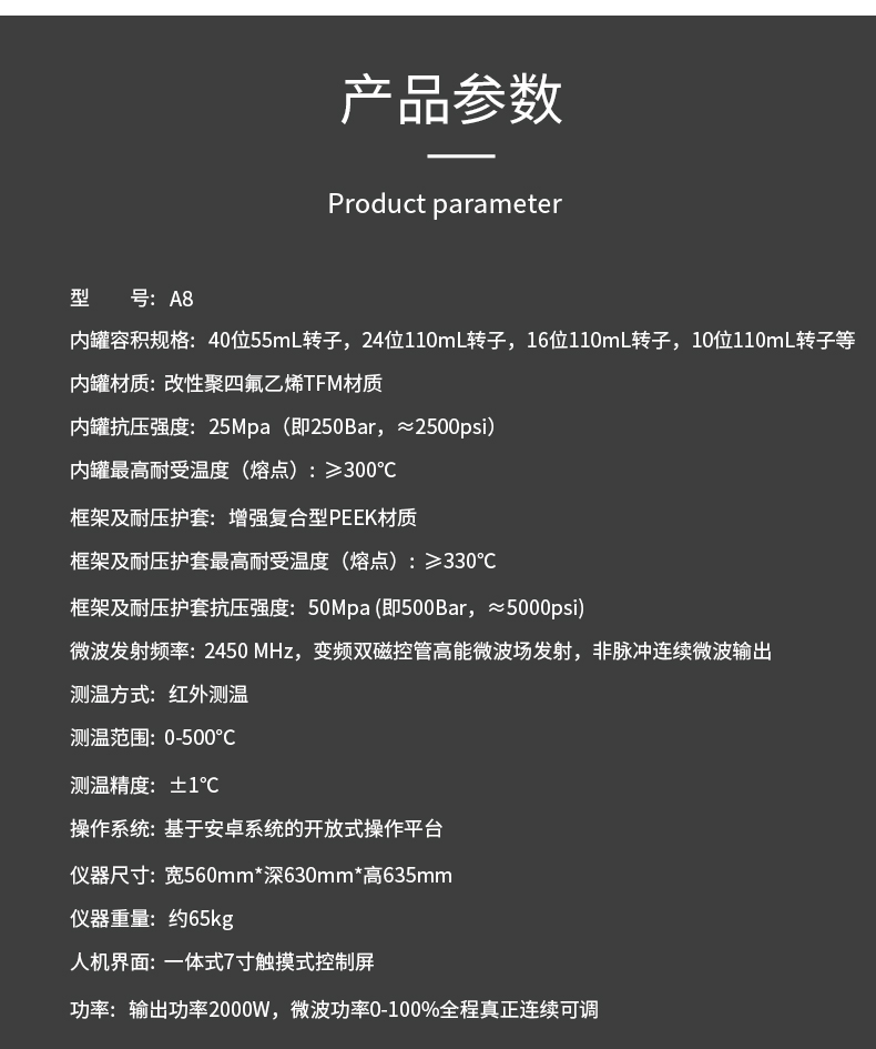 14、微波消解儀的所有型號消解罐內罐、密封塞、密封蓋的材質均為改性TFM、PFA等材料,最高耐受溫度為300℃。