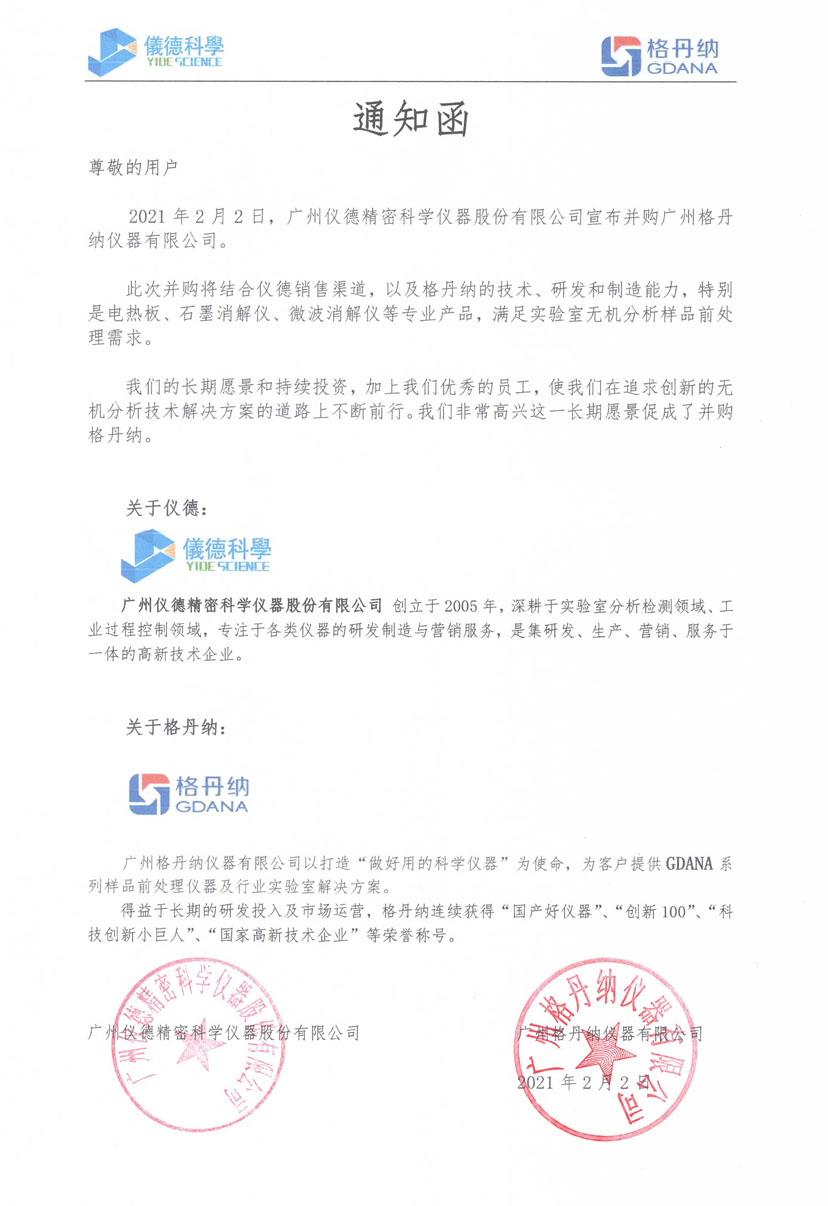 為進一步促進企業的發展,推動公司并購重組工作,茲廣州儀德精密科學儀器股份有限公司于2021年2月2日正式并購廣州格丹納儀器有限公司,特此聲明。