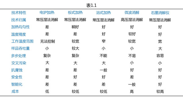 石墨消解儀與其它消解設備的特性對比如表1.1