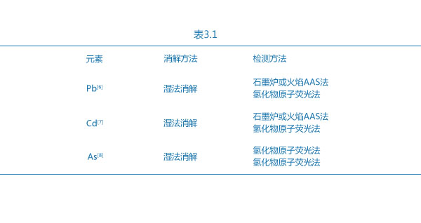 在食品進出口中,重金屬是必檢項目,其消解方法和檢測方法見表3.1。
