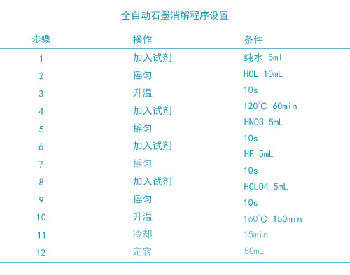 本次試驗使用HCl-HNO3-HF-HClO4混合酸消解體系,將土壤中的晶格全部打開,進行全消解。因用酸量較少,只需準確稱取0.1000-0.2000g左右干燥土壤樣品至特氟龍消解管中,放入全自動消解儀石墨孔中,設置好系統(tǒng)消解方法只需要一鍵啟動就可以自動加酸、搖勻、加熱消解、趕酸、定容。全自動石墨消解儀系統(tǒng)的消解程序及條件見表下面表格。全自動消解儀自動定容到50mL,每批樣品加做雙份全程序空白。