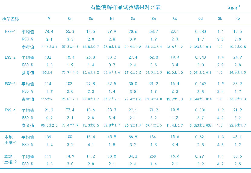 分別準確稱取ESS-1、ESS-2、ESS-3、ESS-4、本地土壤-1和本地土壤-2各6份,樣品轉移至全自動石墨消解儀樣品管中,放進相應的樣品位置,全自動消解進行前處理,統(tǒng)測定消解液中10種重金屬元素的含量。全自動消解測定結果數(shù)據(jù)見下面表格。本方法測定的標準樣品均值都在保證值范圍內,準確度可靠;相對標準偏差在0.5%-4.6%之間,具有較好的精密度。