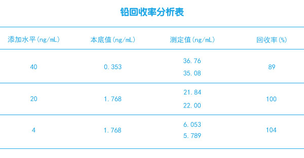 通過對(duì)11個(gè)空白的測(cè)定,以3倍空白的標(biāo)準(zhǔn)偏差所對(duì)應(yīng)的濃度值表示,方法檢出限為2.1ng/mL。精密度以在相同條件下測(cè)定的6次啤酒所得值的相對(duì)標(biāo)準(zhǔn)偏差表示,為8.3%。為了驗(yàn)證方法的實(shí)用性,利用建立的整套方法分析不同樣品中鉛的含量及回收率(見表格回收率測(cè)定結(jié)果)。
