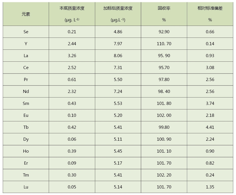 從表中可以看出,使用該方法消解茶葉測定其中的稀土含量,具有很好的回收率和精密度,加標(biāo)回收率和精密度(RSD)分別為92.9%~110.7%和0.24%~4.41%,實(shí)驗結(jié)果滿足要求,該方法可靠,同時適用于其它植物類的應(yīng)用。