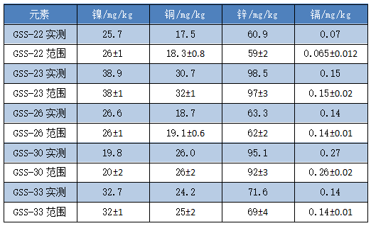 實驗發(fā)現(xiàn)除GSS-23的銅元素檢測值略低于不確定度范圍, GSS-30的鋅元素檢測值略高于不確定度范圍,其余樣品的四類元素檢測結果均在標準值不確定度范圍之內,滿足實驗室土壤檢測實驗的要求。