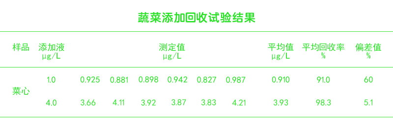 菜心樣品分別添加水平為1.0、4.0μ/gL的標準使用液,試驗設各個平行,各樣品加標回收率和精密度的結果如下表所示。